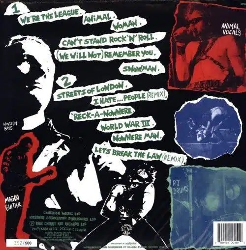 There are two versions of this release. Original first release was withdrawn soon after release due to obscenity law problems. Subsequent re-release has some words changed on side 1 track 2 Animal. Versions can be distinguished by matrix markings – original has A1,1 and B1,1, re-release has A1,2 and B1,2.