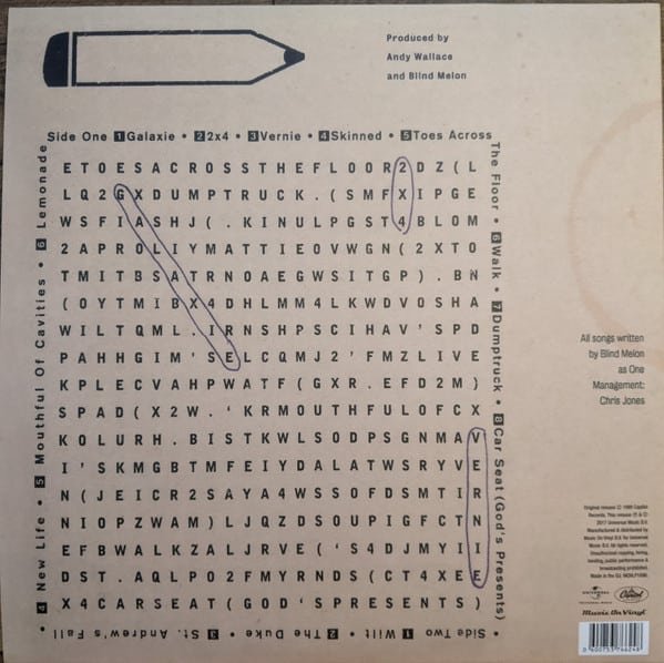 Originally found as a hidden track in the pregap of the [url=https://www.discogs.com/release/1333127-Blind-Melon-Soup]CD[/url] version, track B7 is unlisted and untitled.