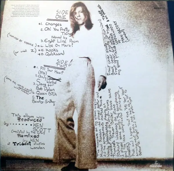Tracks A2/A3 listed as medley on insert and labels, separately on back cover. Track numbering on back cover lists “Life On Mars?” as A3, “Kooks” as A4, “Quicksand” as A5.