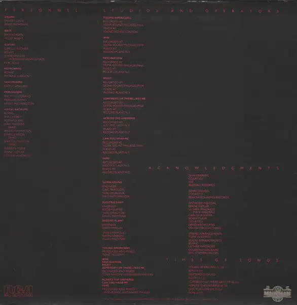 All tracks Recorded at Sigma Sound Philadelphia except B2 & B4 Recorded at Electric Lady N.Y.