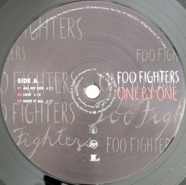 A sticker affixed to the shrink wrap on the front of the record reads: “Foo Fighters One By One Featuring All My Life, Times Like These & Low. Includes Free High Quality MP3 album download: [url=http://www.discogs.com/release/5219167]88697983261S1[/url].