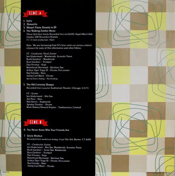 All FZ Works controlled worldwide by the Zappa Family Trust dba Munchkin Music. ©℗mmxii Zappa Family Trust. All rights reserved. Mastered by Chris Bellman, Bernie Grundman Mastering. 2012. Under exclusive license to Universal Music Enterprises, a Division of UMG Recordings, Inc. 2220 Colorado Ave., Santa Monica, CA 90404. Distributed by Universal Music Distribution. Unauthorized reproduction/sampling/distribution/filesharing/rental of any content herein/on is subject to all applicable laws (including cosmic). All Rights of the Artist, deserved & conserved. Heirs preserved & Copyrights Holders reserved. Zappa, Frank Zappa, FZ, Mothers of Invention, The Mothers, Grand Rights & [Zappa moustache logo] are ZFT registered Marks. All rights reserved. This is Zappa Family Archival Matter In Living Ylem. Source: 1972 Analog Master. This is Official Release #94. Register. Vote. www.zappa.com