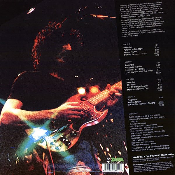 Most of the material in this double set was recorded Dec. 10, 11 & 12, 1973, at The Roxy, Hollywood. Other portions were extracted from road tapes (4-track 15-ips masters) of show #2, Mothers Day, 1974, at the Auditorium Theater in Chicago, and the recent gymnasium extravaganza at Edinboro State College, Edinboro, Pennsylvania, May 8, 1974.