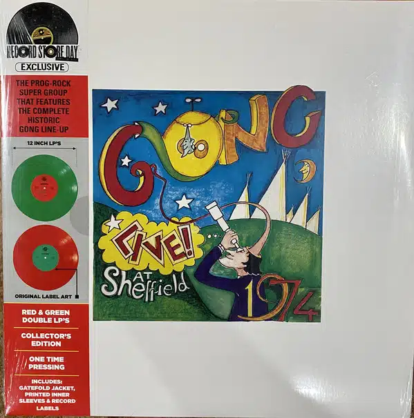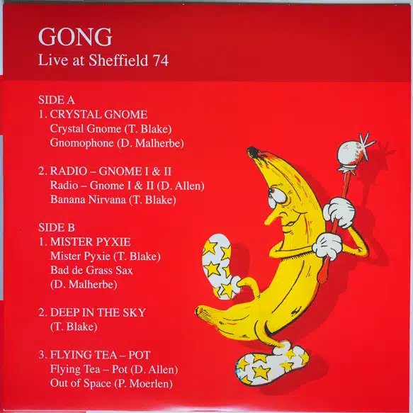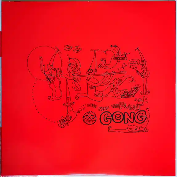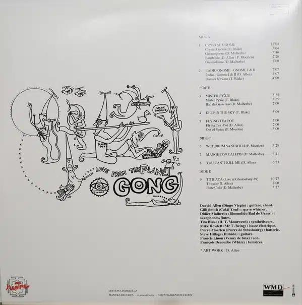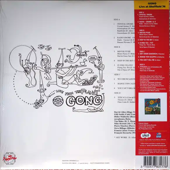 Records are housed in opposing color card sleeves to the vinyl color with track details and Gnomic drawings by Daevid Allen