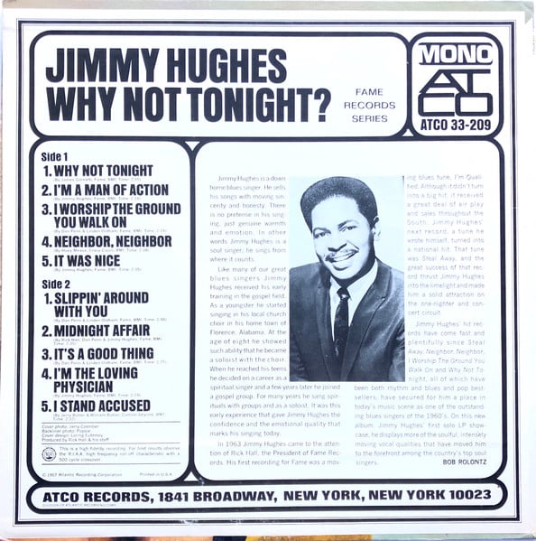 Tracks A1 and A2 originally released on [url=https://www.discogs.com/release/2645780-Jimmy-Hughes-Why-Not-Tonight-Im-A-Man-Of-Action]Fame 1011[/url] (1967).