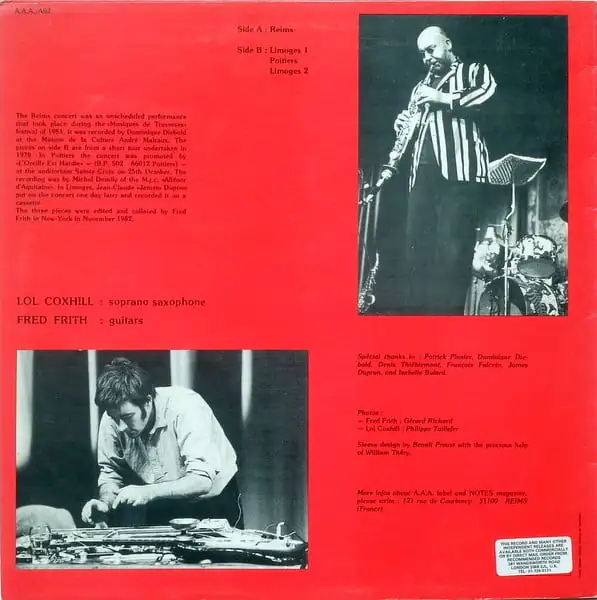 A: recorded during the “Musiques de Traverses” Festival 1981, at the Maison de la Culture André Malraux, in Reims.