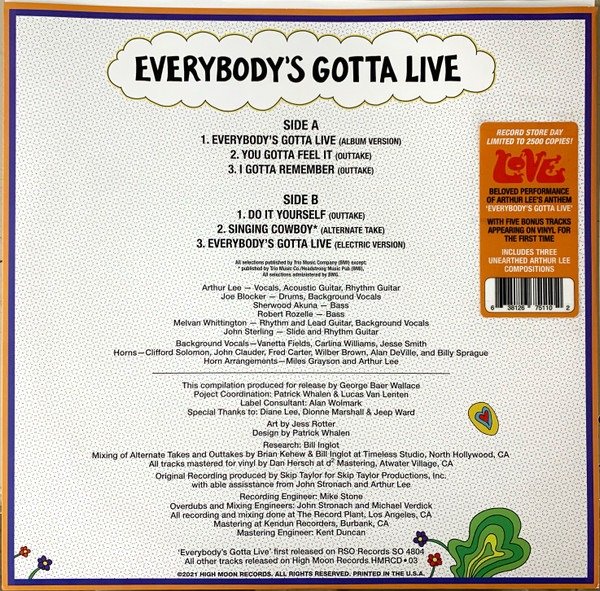 Beloved Performance of Arthur Lee’s Everybody’s Gotta Live with five bonus tracks appearing on vinyl for the first time. Includes three unearthed Arthur Lee Compositions”