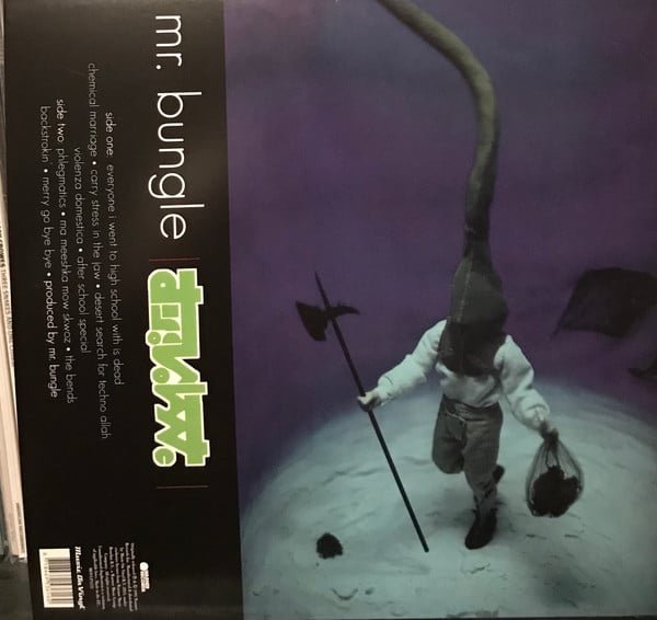 There is a jade coloured sticker affixed directly onto the front cover that reads “Mr. Bungle Disco Volante MOVLP1135”, similar to the 2014 pressing.