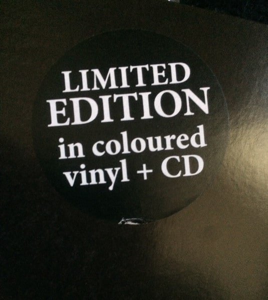 Written on black sticker on shrinkwrapped gatefold: “Limited Edition in coloured vinyl + CD”.