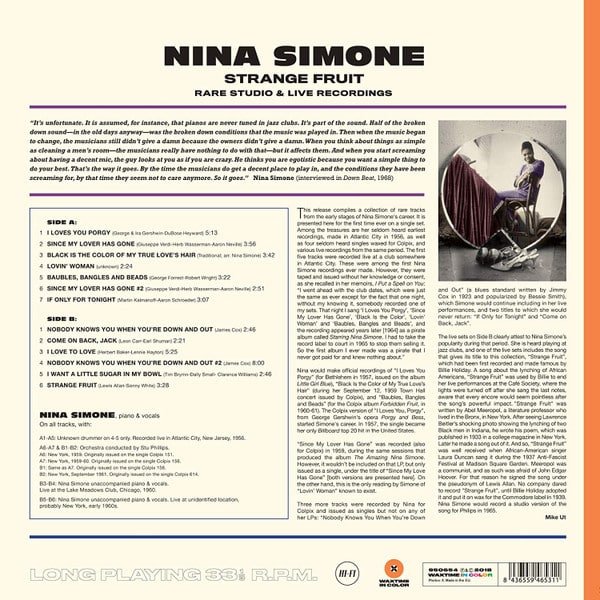 *1 – Although the sleeve notes state that Nina Simone is unaccompanied, she is accompanied by drums and upright bass on both tracks.
