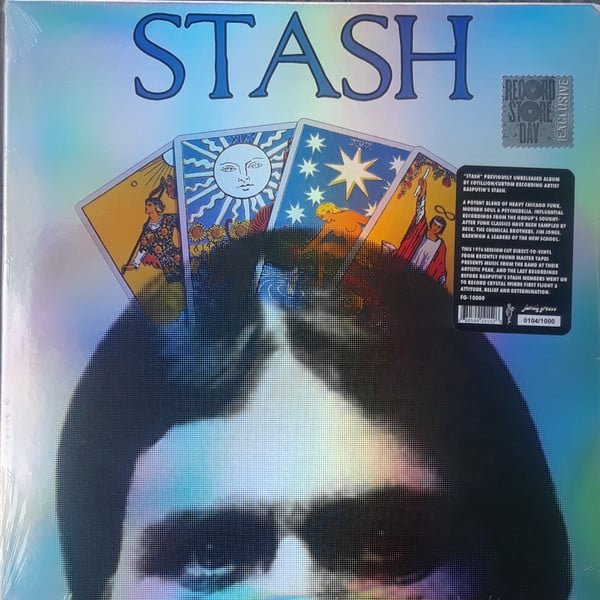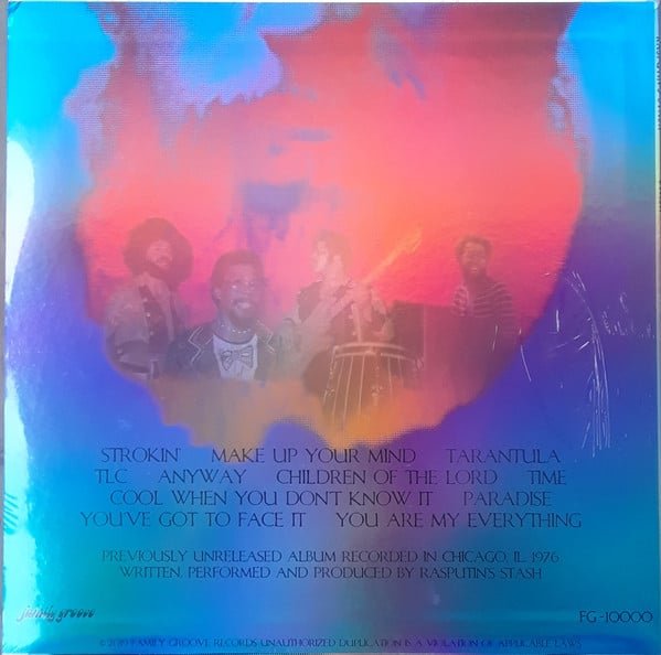 That sticker states: “”Stash” previously unreleased album by Cotillion / Curtom recording artist Rasputin’s Stash. A potent blend of heavy Chicago funk, modern soul & psychedelia. Influential recordings from the group’s sought-after funk classics have been sampled by Beck, the Chemical Brothers, Jim Jones, Raekwon & Leaders of the New School. This 1976 session cut direct-to-vinyl from recently found master tapes presents music from the band at their artistic peak, and the last recordings before Rasputin’s Stash members went on to record Crystal Wind’s First Flight & Attitude, Belief and Determination.”