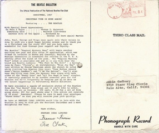 A 7″ x 8-1/2″ piece of cardboard, with the record, Seasons Greetings from The Beatles, on one side. The other side has the address and cancellation, New York, NY) on the right side, and on the left says The Beatle Bulletin. The Official Publication of the National Beatles Fan Club, Christmas, 1967. The Beatle Bulletin with news of “Magical Mystery Tour” and an offer of photos.