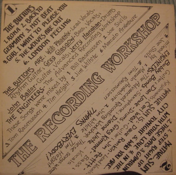 This appears to be a limited pressing of recordings created by a recording school in Chillicothe OH called The Recording Workshop. Each track by The Buttons is mixed by a different person (a student?), and the same applies to the other side of this vinyl LP by Native Sun.