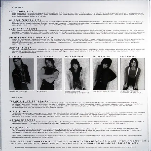All songs written by Ric Ocasek copyright © 1978 Lido Music (BMI) except “Moving In Stereo” copyright © 1978 Lido Music (BMI) and Oversnare Music (ASCAP).
