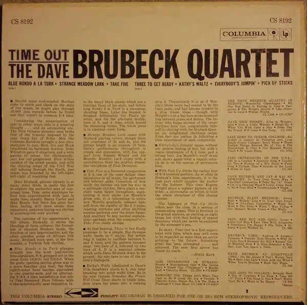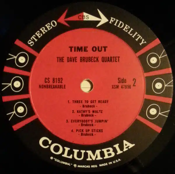 6-eye red Columbia with black ring around label. Cover has border. CBS logo and STEREO <–> FIDELITY on the top of the label. The cover does not say “Featuring Take Five”. CBS logo used by Columbia 1961-1962.