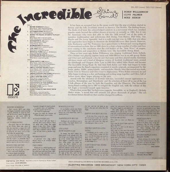 US release date 1967 – Goldmine Standard Catalog of American Records 8th Edition, bsnpubs [url=http://www.bsnpubs.com/elektra/elektra7100.html]Elektra Album Discography, Part 2[/url], Wikipedia [url=https://en.wikipedia.org/wiki/The_Incredible_String_Band_(album)]The Incredible String Band (album)[/url] . The 1967 date is confirmed by the catalog number and the absence of ‘2 Dean St., London’ address on jacket which was removed from jackets that year.