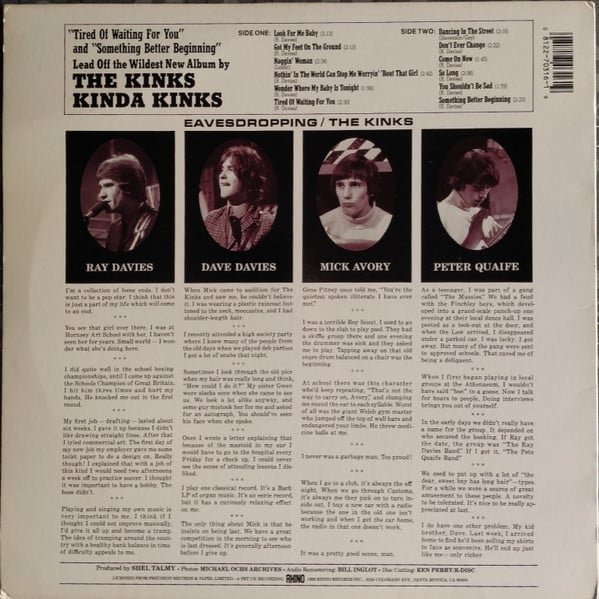 Yellow labels with 1201 Olympic Blvd. address. Includes plastic Rhino Records mail order innersleeve.