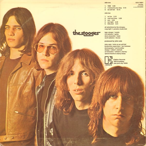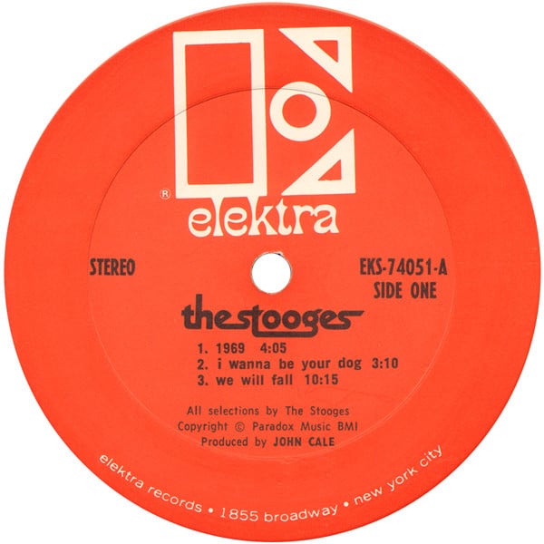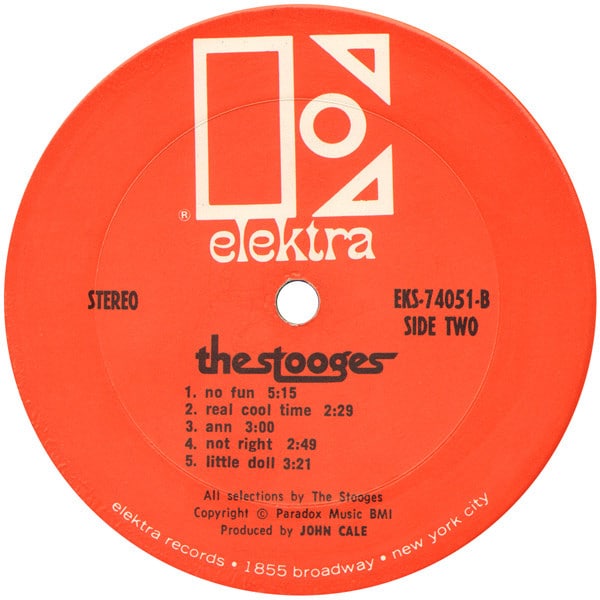 Label and pressing variation, red ‘Big E’ with ‘The Stooges’ logo, and ‘Stereo’ printed on the left side of the spindle holes and pressed by [l403953] per ‘CTH’ in runouts. Includes orange/white printed paper Elektra inner sleeve. This release features a single pressing ring with a diameter of 69mm. Almost identical to [r14980728].