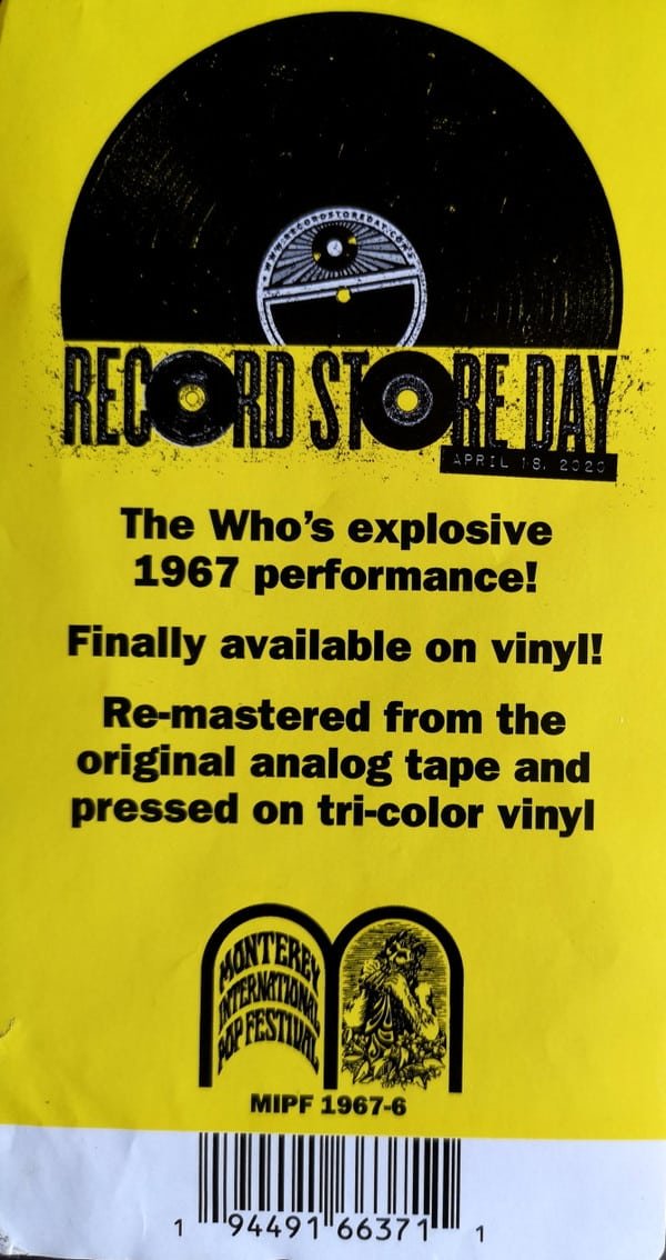 The Who’s incendiary live performance at the legendary 1967 Monterey International Pop Festival, available for the first time on vinyl. Classic high-gloss tip-on style jacket, printed inner sleeve and red/white/blue striped vinyl, for Record Store Day 2020.