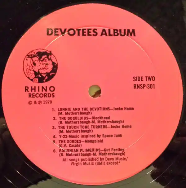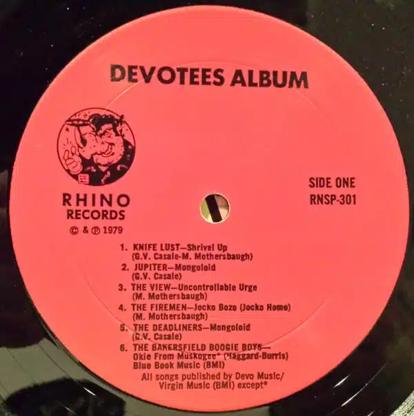 “This LP was compiled from tapes sent in by KROQ listeners during the summers of 1978 and 79. [l=KROQ], [l=Rhino Records (2)] and [a=Devo] would like to thank all the mutants who entered the Devotees contest.”