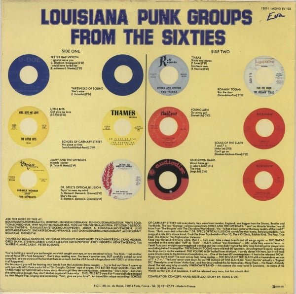 Tracks B7 & B8 are credited to ‘Unknown Band’ on the cover. The band name is sourced from the [url=http://comps.soybomb.com/compsproject/comptitle2.php?&scompid=273&lifilter=4&lispeed=1]Searchin’ For Shakes[/url] garage/psych compilation database.