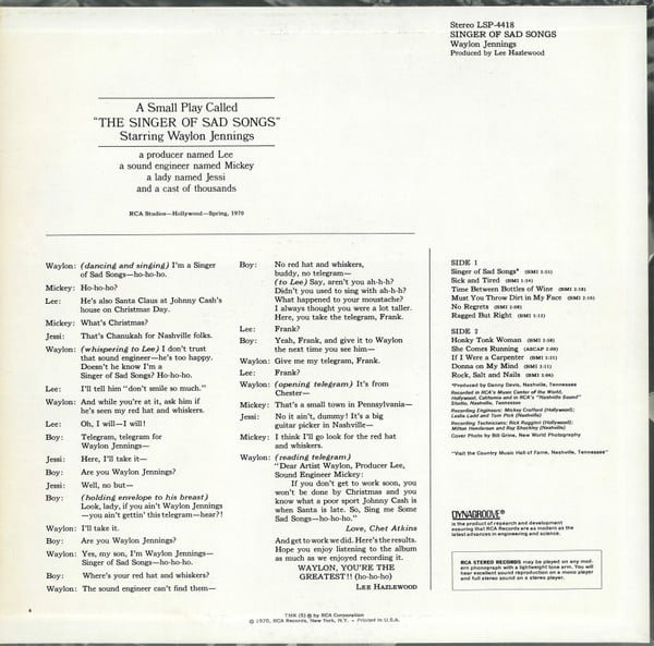 From the back cover; “A Small Play Called ‘The Singer Of Sad Songs’ Starring Waylon Jennings, a producer named Lee, a sound engineer named Mickey, a lady named Jessi, and a cast of thousands.”